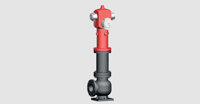 Valve inférieure avec fermeture par ressort, entrée coudé 90º avec bride DIN PN-16 et mécanisme d’actionnement sur carte étanche.